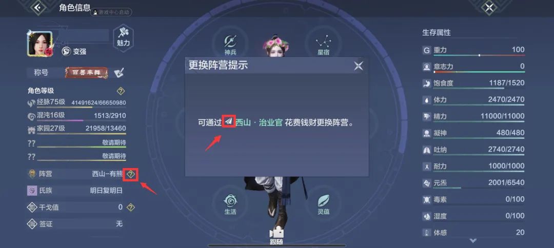 旅者可前往本阵营对应的【治业官】处更换阵营(需消耗500脂玉)。治业官在故地主城的阵营首领旁,在【角色信息】界面左下角,点击阵营旁的问号,点击“小飞机”图标即可快速打开地图进行定位。
