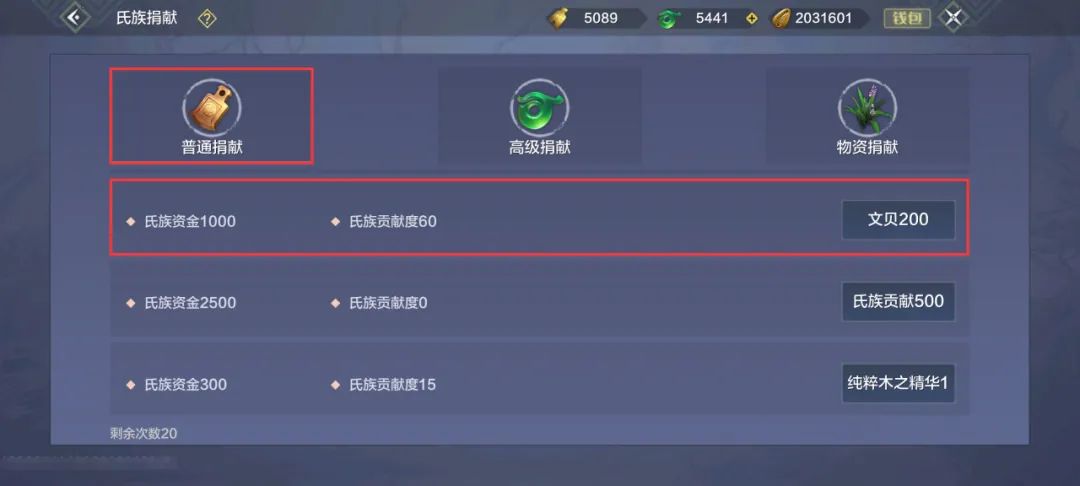 氏族贡献分为三种,普通捐赠、高级捐赠、物资捐赠。前两个捐赠可以为氏族增加氏族资金,后一个可增加氏族资源,但无法增加氏族资金。(PS:部分氏族会要求成员不可捐赠纯物资,指的就是不可20次都是物资捐赠)