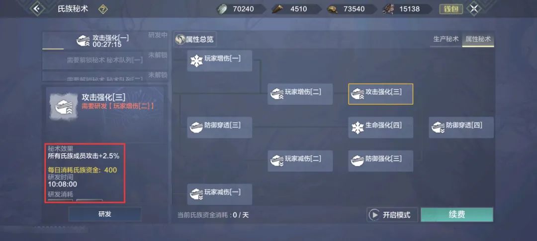 ● 属性秘术:强化氏族成员的属性,研发时消耗氏族资源,后续开启属性秘术效果,每日都会消耗氏族资金。