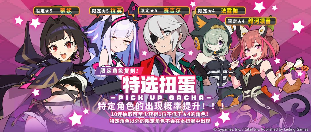 本次精选扭蛋中,限定★5角色「蒂妮」、「拉芙」、「赛吉尔」、限定★4角色「绯河凛音」、「法露伽」的抽取,且出现概率提升!