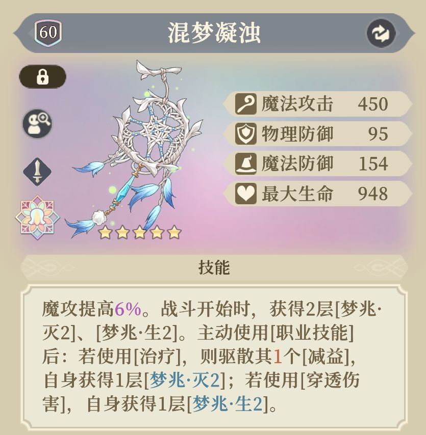 - 4→5星的提升:魔攻、治疗效果提高12%。行动结束时,对自身范围6格内所有敌人施加[梦魇],若目标已有[梦魇],则额外施加[迷梦回廊2]、随机1个[2级减益],所有效果持续2回合。