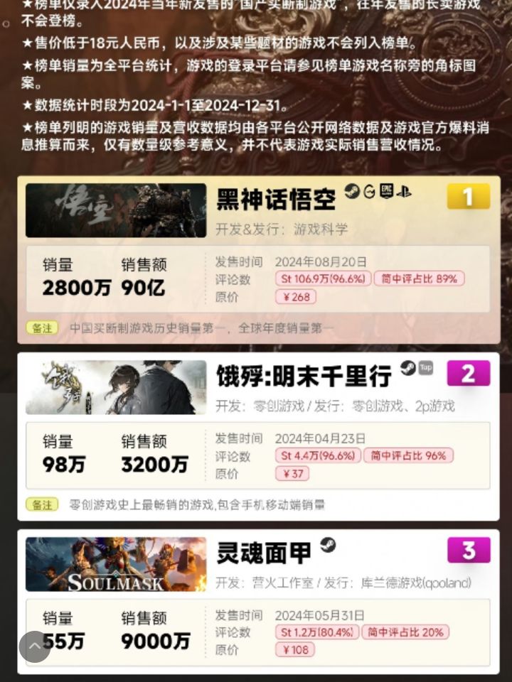 国游销量榜官方今日发布了《2024年国游销量年榜》,统计时间为2024年1月1日~12月31日全年。