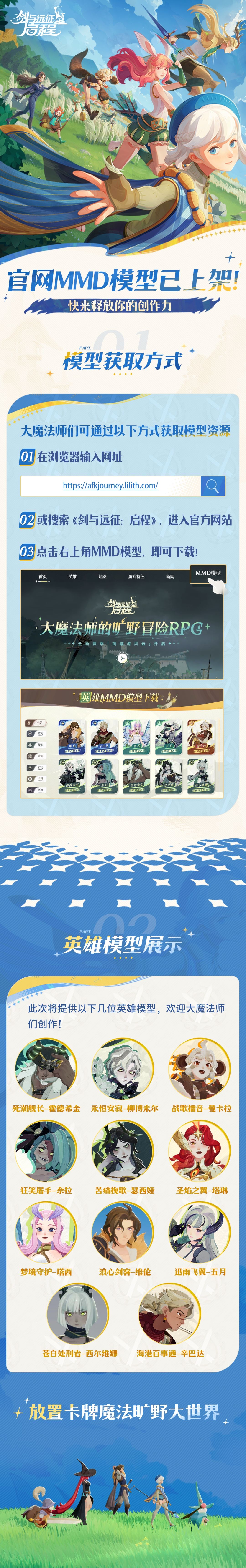 满满要向你隆重介绍,《剑与远征:启程》官方网站新增了角色MMD模型板块,欢迎大魔法师们下载创作。
