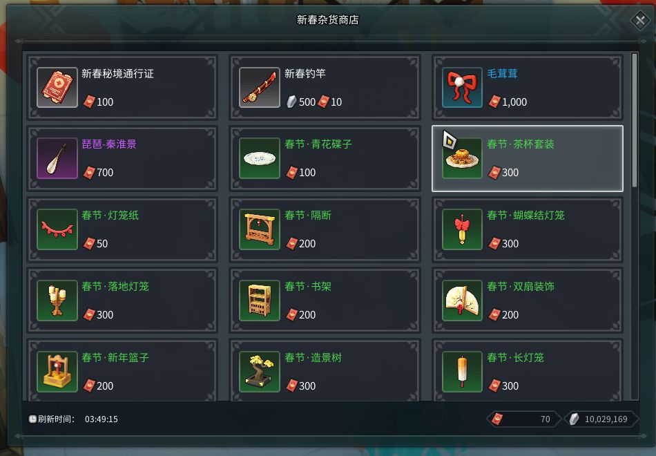 摊主的新春商店出售了很多节日好物,积攒足够的礼券可以前往兑换哦。