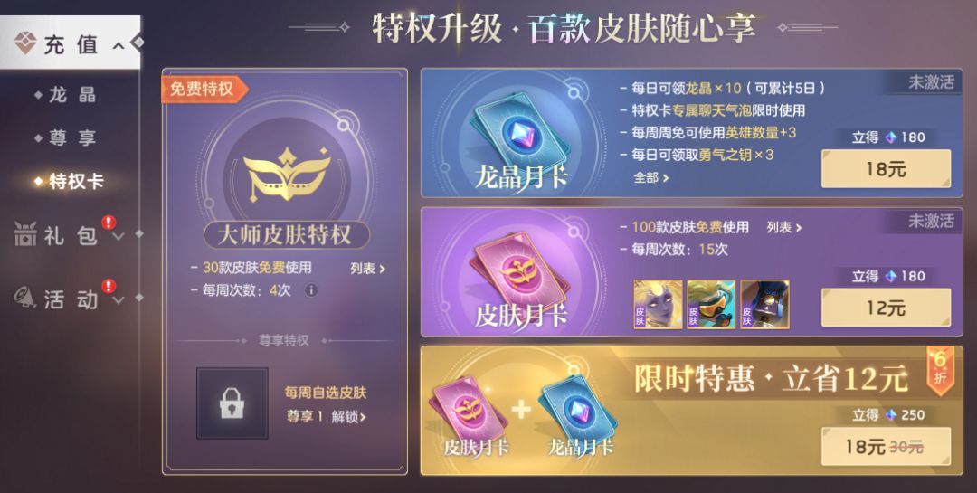 大师1阶即可获得皮肤使用特权,每周可免费使用含传说品质在内的多款皮肤。提升大师等阶可增加每周特权使用次数。