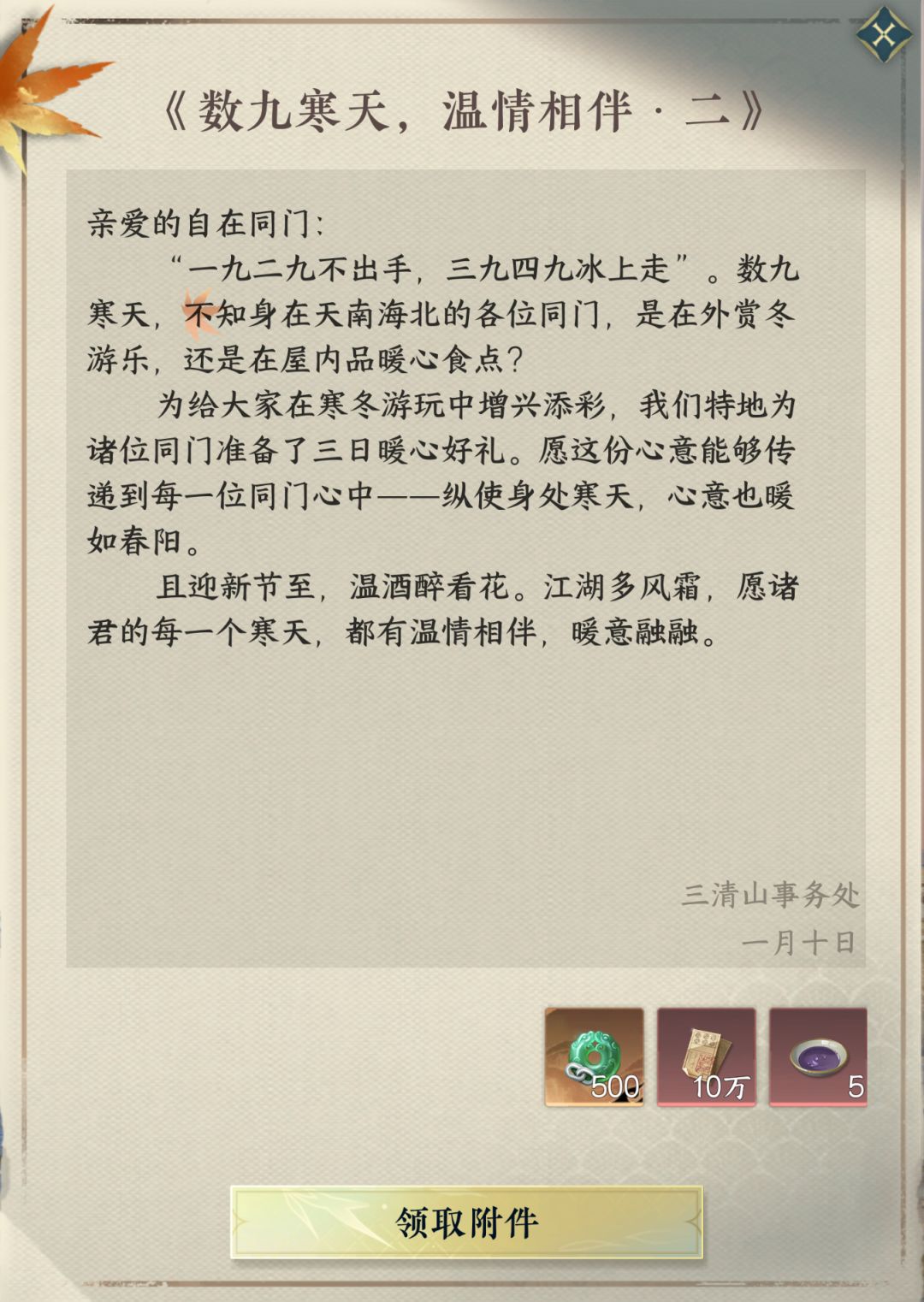 今天(1月10日),逆水寒春节超前福利持续派送中!登录游戏即可领取惊喜新春邮件,内含500绑玉+10万交子+螺黛染*5哦!在这里,提前祝大家新年顺利啦!