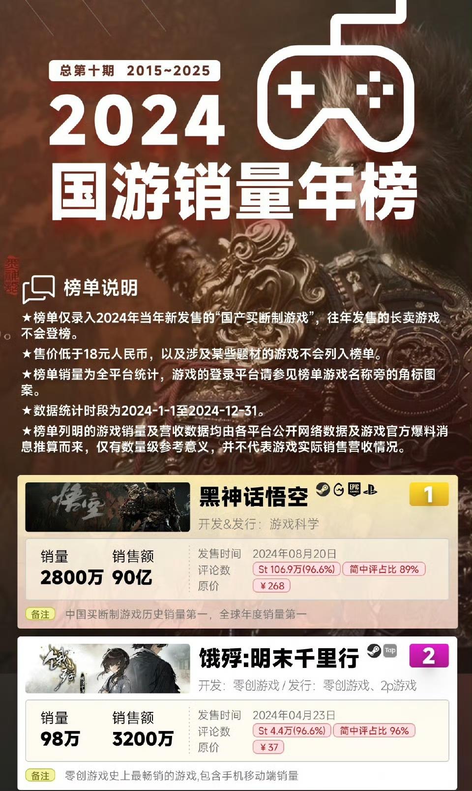 1/10号,零创游戏发文,庆祝并感谢《饿殍:明末千里行》夺得2024年国产单机游戏销量榜排名第二❗❗❗