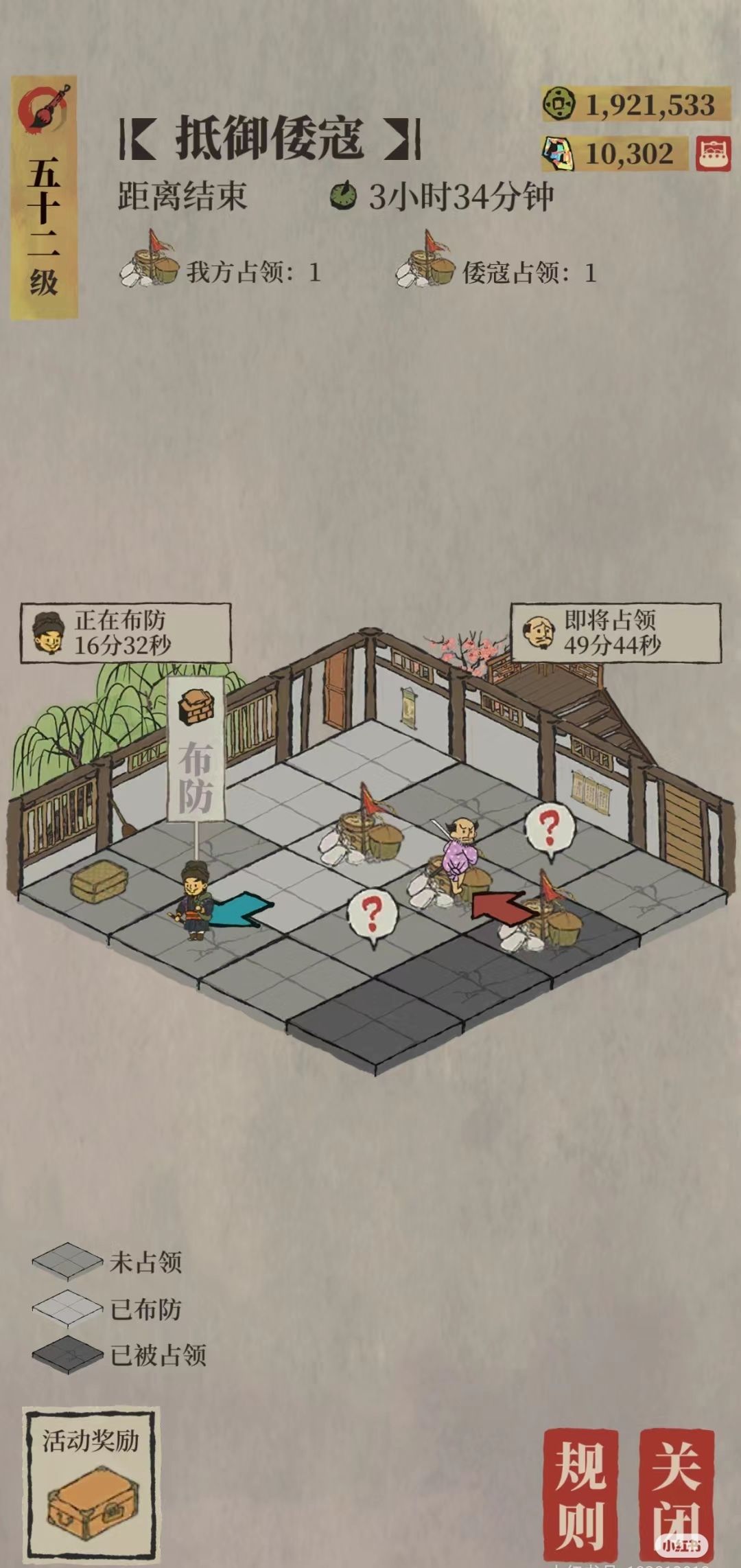 派遣擅长探险的特殊居民,需要抢在倭寇入侵据点前在每个据点布防。布防所需的物资随机,数量随机。