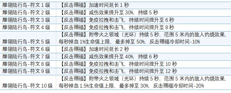 翎陆行鸟技能【反击赐福】短时间增加自己移速,移速加成从40%渐渐增加到70%,持续4秒,加速期间减伤20%,并且免疫拉拽和击飞效果。技能更偏向于自保。