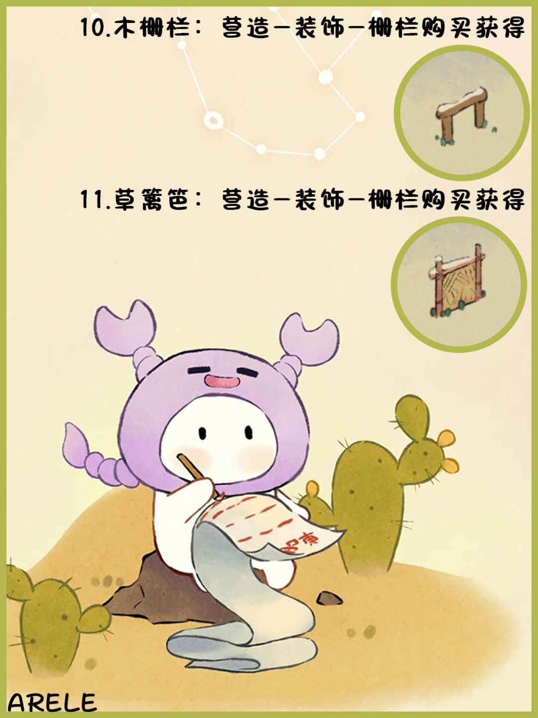 11.草篱笆:营造—装饰—栅栏购买获得(300铜钱一个),有同款门(见最后实物展示)