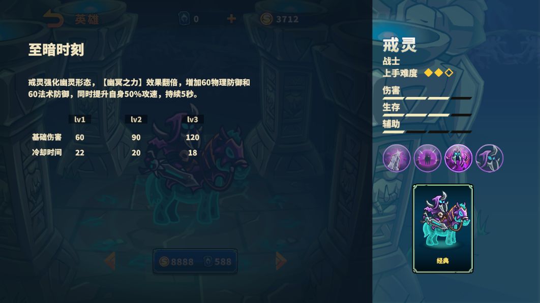戒灵是一位战士类型英雄,其拥有较高的伤害和生存能力