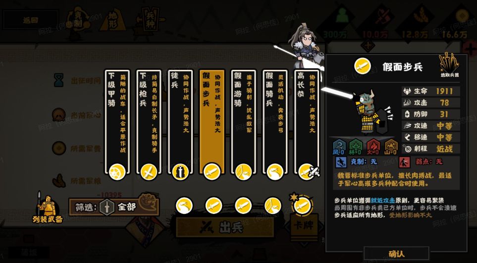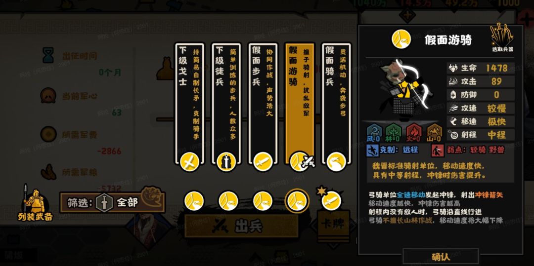 与此同时,释放政策‘入阵’,乐感等级+1的同时,将解锁3个假面兵种。分别为:假面游骑、假面骑兵、假面步兵。