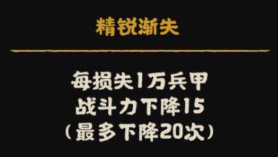 精锐渐失:每损失1万兵甲,战斗力下降15 (最多下降20次)