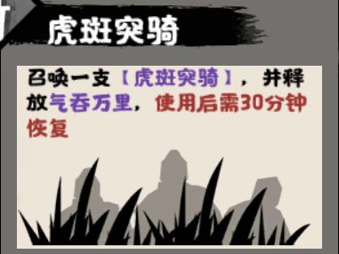兵种:虎斑突骑召唤一支【虎斑突骑】,并释放气吞万里,使用后需30分钟恢复