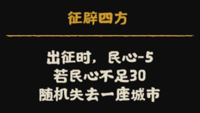 征辟四方:出征时,民心-5,若民心不足30,随机失去一座城市