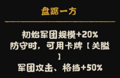 盘踞一方:初始军团规模+20%,防守时,可用卡牌【关隘】,军团攻击、格挡+50%