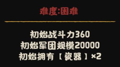 初始战斗力360、初始军团规模20000、初始拥有【瓷器】x2
