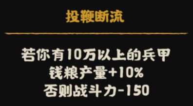 投鞭断流:若你有10万以上的兵甲,钱粮产量+10%,否则战斗力-150