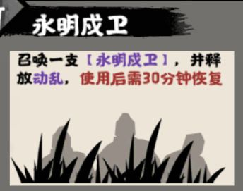 兵种:永明戍卫召唤一支【永明戍卫】,并释放动乱,使用后需30分钟恢复