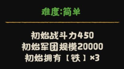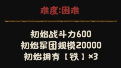 初始战斗力600、初始军团规模20000、初始拥有【铁】x3