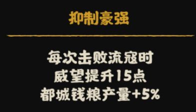 抑制豪强:每次击败流寇时,威望提升15点,都城钱粮产量+5%