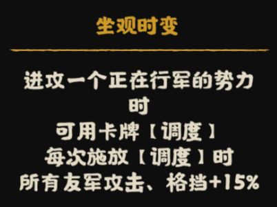 坐观时变:进攻一个正在行军的势力时,可用卡牌【调度】每次施放【调度】时所有友军攻击、格挡+15%
