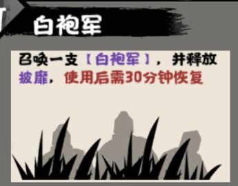 兵种:白袍军召唤一支【白袍军】,并释放披靡,使用后需30分钟恢复