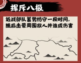 卡牌效果:挥斥八极近战部队蓄势防守一段时间,随后击晕周围敌人并造成伤害