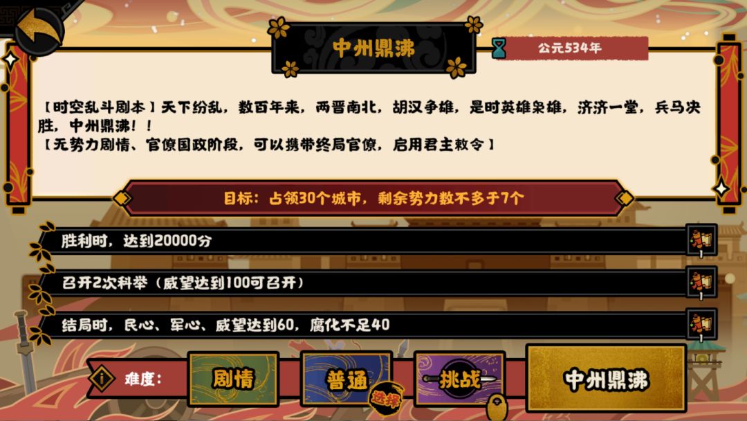 国家特性:‘难度’简单、南北归一、广开言路初始战斗力450、初始军团规模20000、初始拥有【铁】x3