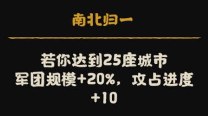 南北归一:若你达到25座城市,军团规模+20%,攻占进度+10