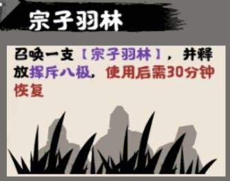 卡牌效果:宗子羽林召唤一支【宗子羽林】,并释放挥斥八极,使用后需30分钟恢复