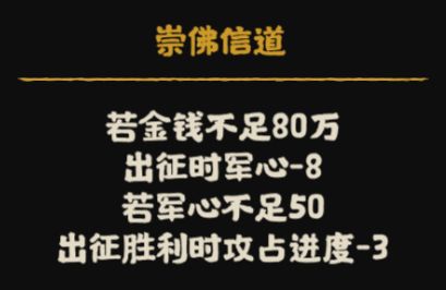 崇佛信道:若金钱不足80万,出征时军心-8,若军心不足50,出征胜利时攻占进度-3