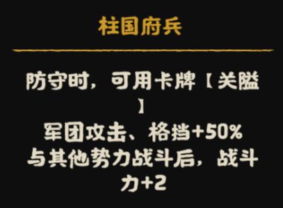 柱国府兵:防守时,可用卡牌【关隘】军团攻击、格挡+50%,与其他势力战斗后,战斗カ+2