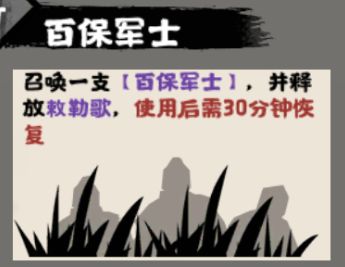 兵种:百保军士召唤一支【百保军士】,并释放救勒歌,使用后需30分钟恢复