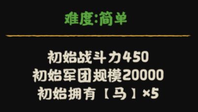 国家特性:‘难度’简单、威望消弭初始战斗力450、初始军团规模20000、初始拥有【马】x5