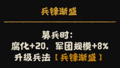 兵锋渐盛:募兵时,腐化+20,军团规模+8%。升级兵法【兵锋渐盛】【兵锋渐盛】:可使用器械【冲车】(1级),出征胜利时,攻占进度+5