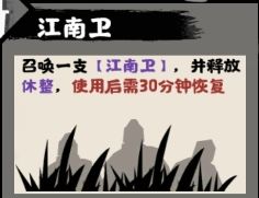 使用兵种:江南卫召唤一支【江南卫】,并释放休整,使用后需30分钟恢复