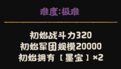 初始战斗力320、初始军团规模20000、初始拥有【墨宝】x2