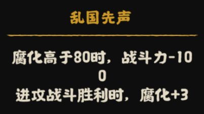 乱国先声:腐化高于80时,战斗力-100,,进攻战斗胜利时,腐化+3