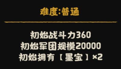 初始战斗力360、初始军团规模20000、初始拥有【墨宝】x3