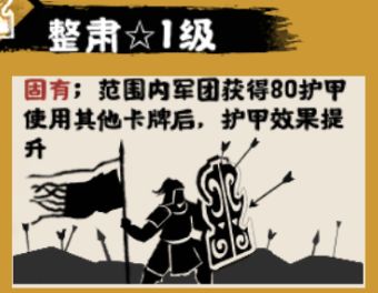 卡牌效果:整肃1级固有;范围内军团获得80护甲,使用其他卡牌后,护甲效果提升