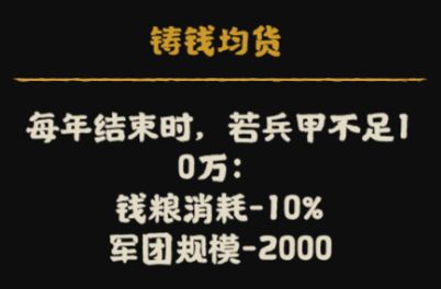 铸钱均货:每年结束时,若兵甲不足10万,钱粮消耗-10%,军团规模-2000