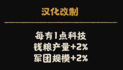 汉化改制:每有1点科技,钱粮产量+2%,军团规模+2%