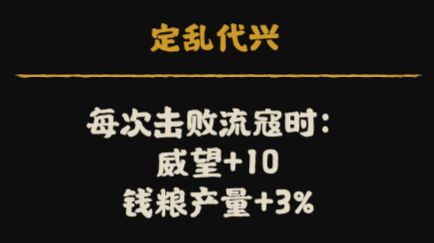 定乱代兴:每次击败流寇时,威望+10钱,粮产量+3%