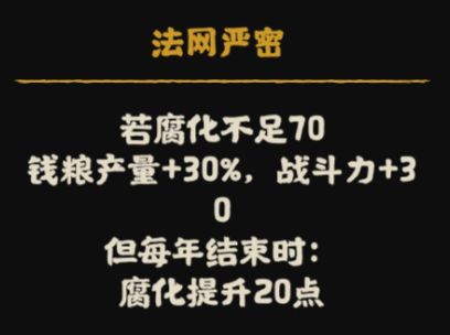 法网严密:若腐化不足70,钱粮产量+30%,战斗力+30。但每年结束时,腐化提升20点