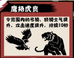 卡牌效果:鹰扬虎贲令范围内的弓骑、轻骑士气提升、攻击速度提升,持续10秒