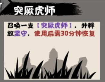 兵种:突厥虎师召唤一支【突厥虎师】,并释放坚守,使用后需30分钟恢复