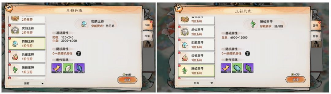 但其实这些乱七八糟的我们都不需要了解,我们只需要知道,玉符的主要功能是作为灵阵的载体,其本身所带来的属性加成与灵阵带来的加成相比微乎其微,关于玉符,我们需要关注的只有两点:品质、随机词条;