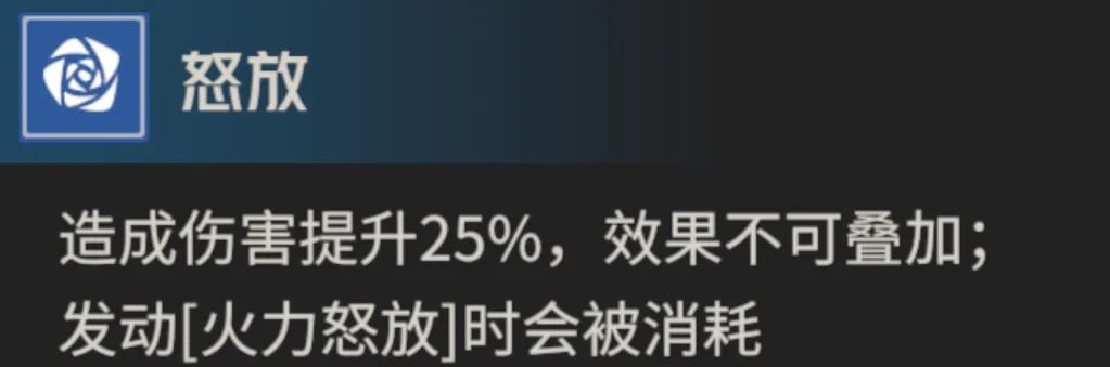 然后行动开始和出击时获得的“怒放”状态,也能为其提供25%的增伤,而虽然这个“怒放”可以最高叠加2层,但增伤的效果却不会叠加生效,此外考虑到γ2区基础算力和10算力两个效果,“怒放”状态的持续时间也是相当稳定的,基本上整场战斗中都能保证至少有1层“怒放”和25%增伤效果的覆盖。