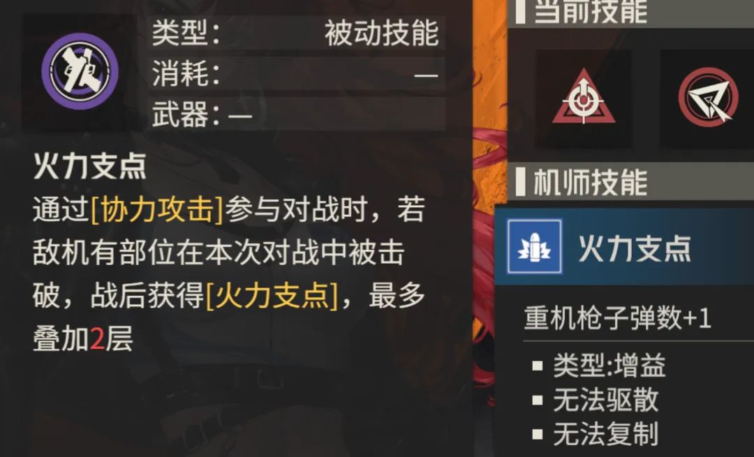 然后【火力支点】技能还有定向提升重机枪子弹数的效果,那么如果是叠满2层【火力支点】的前提下,则基础玛蒂尔达基础重机枪的子弹数会变为13颗,消耗1层“怒放”状态后会提升为19颗,消耗2层“怒放”状态后会提升为24颗......对比刚刚基础下的20颗相当于又有20%的提升。